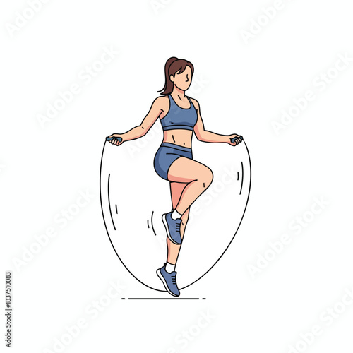 Woman doing exercises with jump rope, vector flat illustration isolated on white background. Skipping rope cardio gym workout, fitness, weight loss, sport activity.