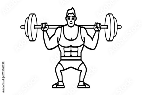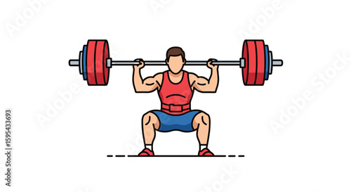 Bodybuilder doing back squats with barbell, vector flat illustration isolated on white background. Weightlifting, strength training, pumping iron, sport activity, gym workout, weight exercise.