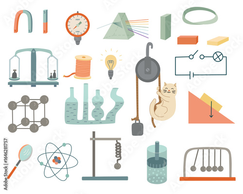 Fitness and workout exercise in gym. Vector set of gym icons in flat style isolated on white background. Gym equipment, dumbbell, weights, treadmill, ball.