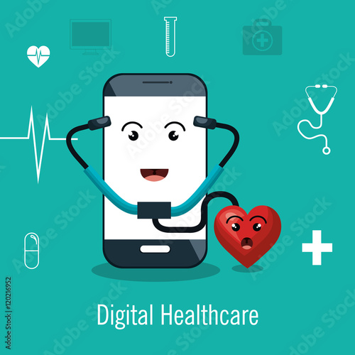 Smart phone with bodybuilder on screen and gym equipment around it, vector illustration. Fitness mobile application mockup concept.