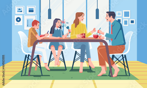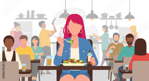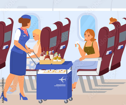 Flight attendant serving food and drinks to passengers on aircraft board vector illustration. Stewardess in uniform offer beverage and meal to people in economy class. Airplane travel