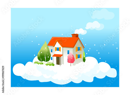 Flood disaster vector. House under pouring rain icon. Hurricane, storm or tsunami in city area scene. Big monsoon shower illustration isolated on white background
