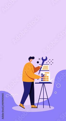 Micro male and female characters making huge bouquet of flowers, vector illustration. Florist services, flower shop, floral arrangements concept for web banner, website page etc.