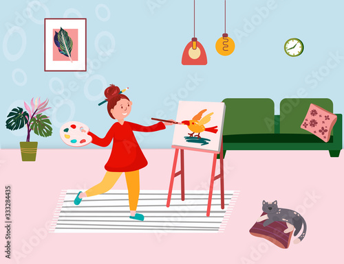 Vector illustration of woman creating flower arrangement, flower shop interior. Florist concept flat style design element.