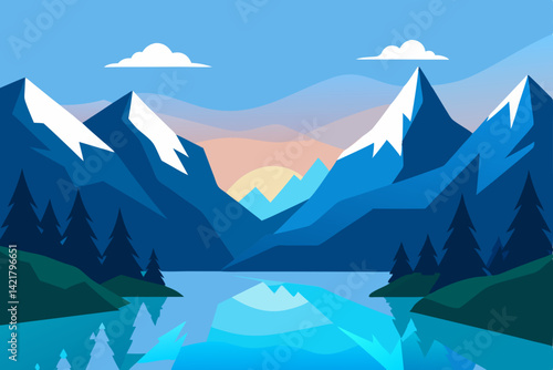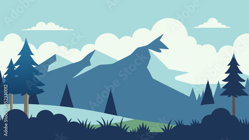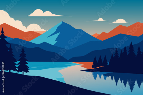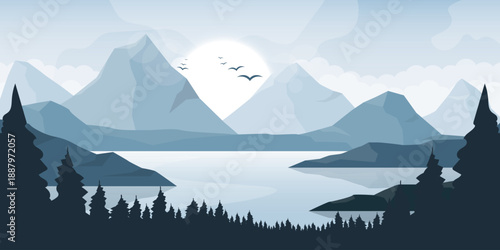 Airplane flying above forest, mountains and river, aerial view vector illustration in paper craft art style design. Travel by air concept for poster banner, website page etc.