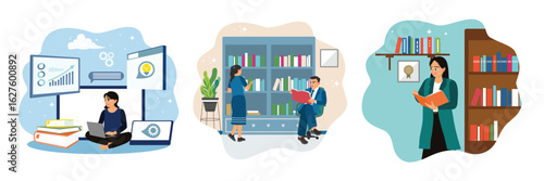 Food delivery set, flat vector isolated illustration. People ordering, chef preparing and courier delivering fast food, pizza, groceries. Online food order. Safe contactless delivery service.