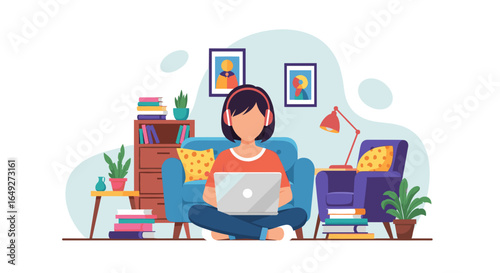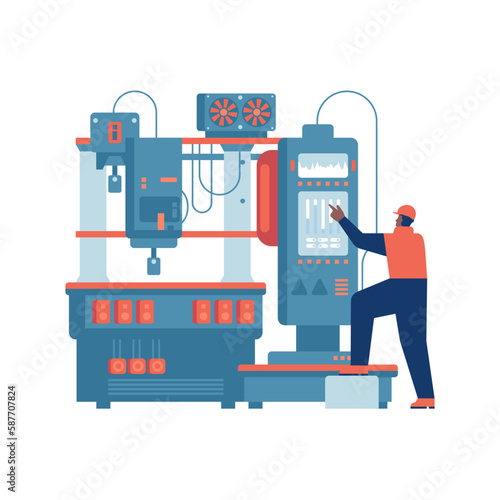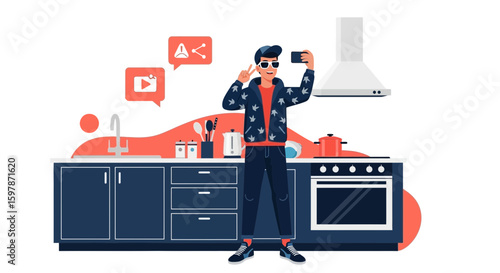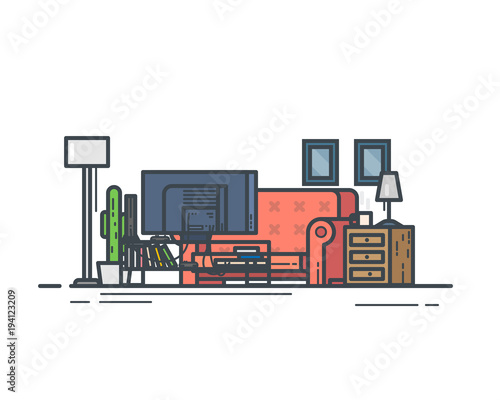 Happy male characters, two friends watching football or soccer game on TV in living room at home, vector flat style design illustration. Football fans, live soccer streaming on tv concepts.