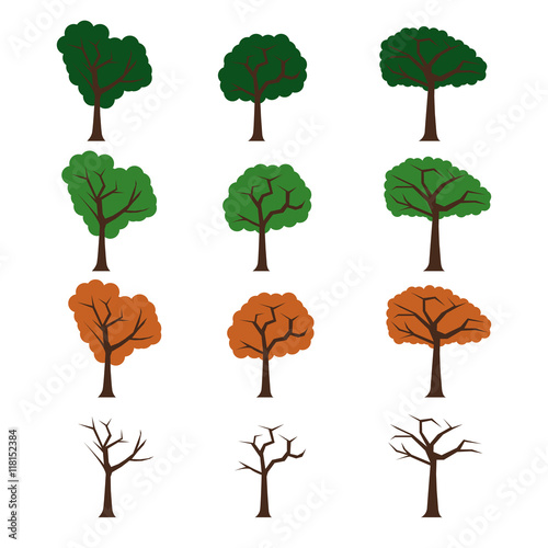 Trees and bushes set, flat vector isolated illustration. Forest, garden trees, shrubs covered with green, yellow, red leaves and stripped of their leaves.