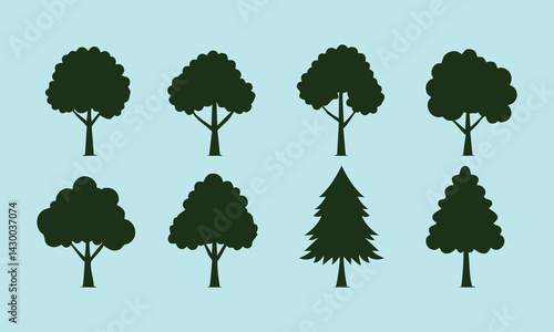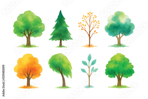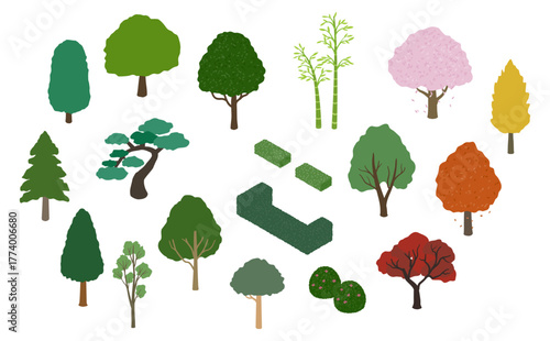 Trees and bushes set, flat vector isolated illustration. Forest, garden trees, shrubs covered with green, yellow, red leaves and stripped of their leaves.