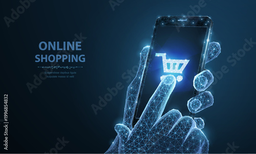 Vector polygonal art raised up clenched fist and broken iron chain. Low poly wireframe mesh with scattered particles and light effects on dark blue background. Freedom concept poster banner template.
