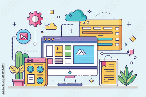 Freelance during summer vacation, vector poster template set. Workplace on summer tropical beach, people relaxing, working and enjoying beach activities. Work remotely and travel the world.