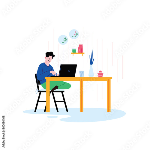 Freelance. Young man working from coffee shop, flat vector illustration. Cafe workplace. Freelancer male character working on laptop and drinking coffee sitting at table. Remote work, online learning.