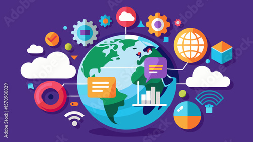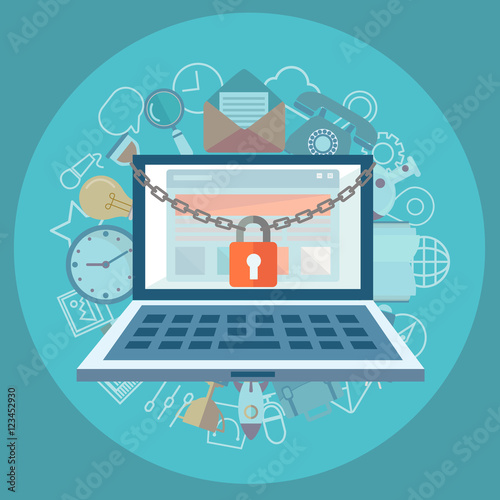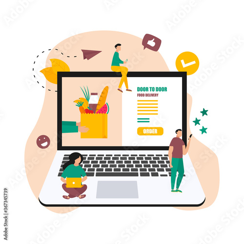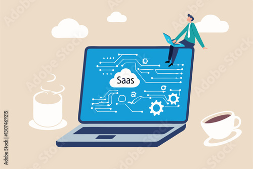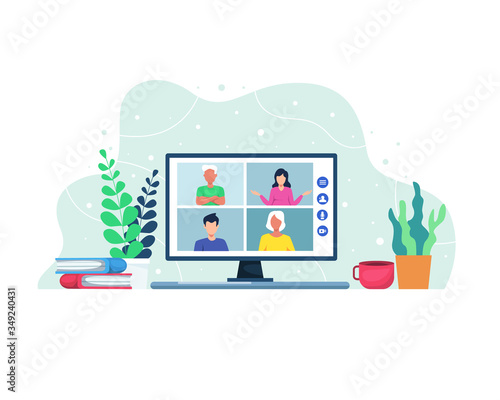 Freelancer work vector flat illustration. Laptop, mouse, headphones, dollar coins, cactus, cup of tea with lemon, marshmallow and vase with flowers. Remote work, home workplace with modern equipment.
