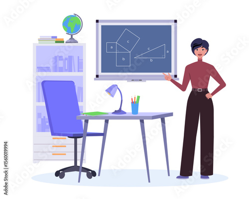 Young man freelancer sitting at table and working on laptop at home office, vector flat illustration. Home workspace with scrum board. Working remotely, freelancing concepts.