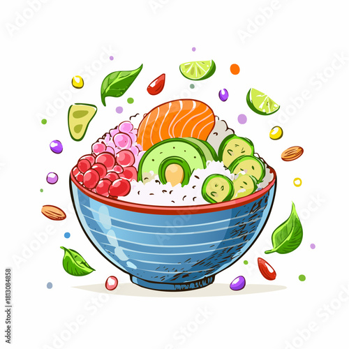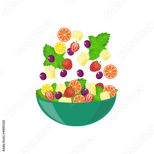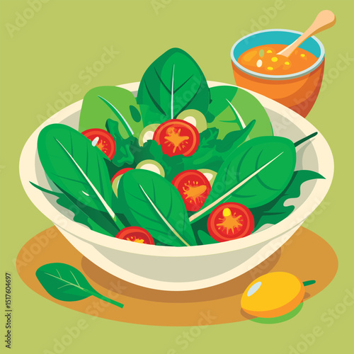 Fresh greek salad of greens and vegetables sprinkled in a deep plate. Salad recipe with lettuce, tomato, greek cheese, onion and olives. Vector hand drawn illustration.