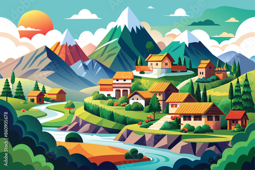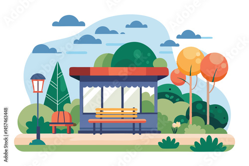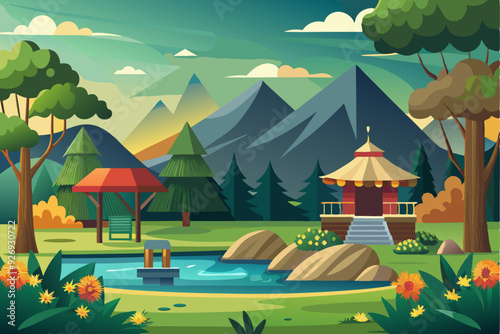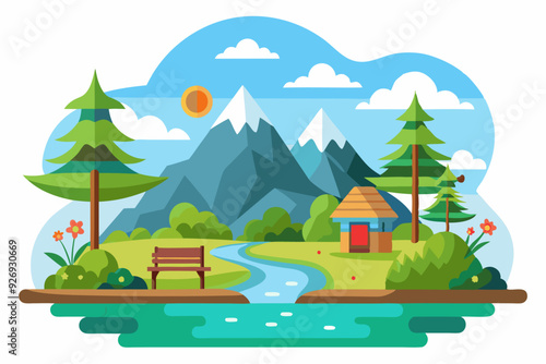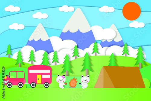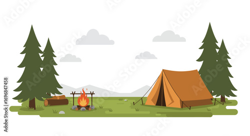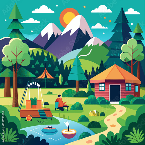 Friends at campsite vector. People outdoors picnic at campsite on nature. Man and woman trailer camper rest on river bank in forest. Traveling in weekend activity illustration