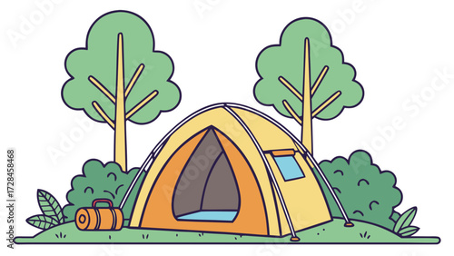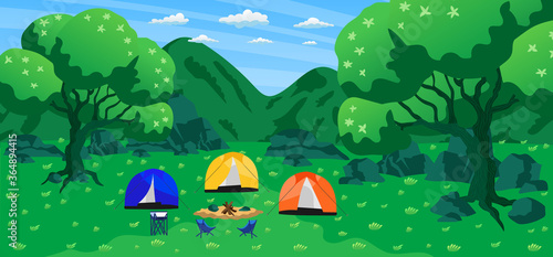 Friends camp in forest vector illustration. Cartoon touristic summer campground with resting people. Tourism in nature and mountain campsite