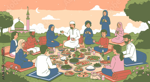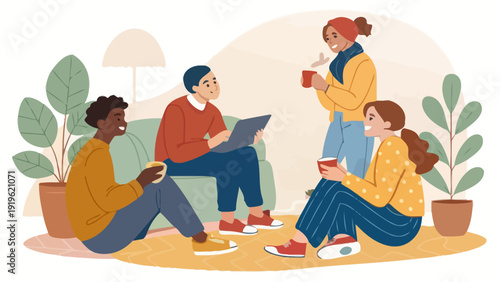 Friends drink tea at home. Tea ceremony concept vector illustration. People sitting on floor and sofa, drinking tea and talking.