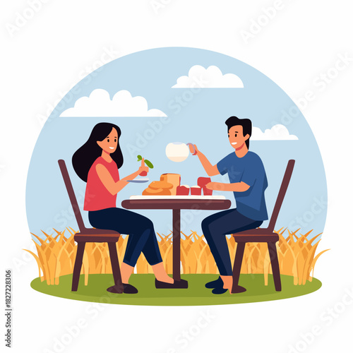 BBQ party in city park. Men friends eating grilled sausages, drinking beer. Vector flat style design illustration.