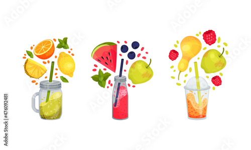 Mixed fruit juice packaging glass bottle, paper cut craft style fresh plum, apricot, apple, pear, citrus fruits, liquid splashes and drops, vector illustration. Healthy natural beverage.