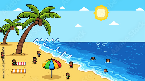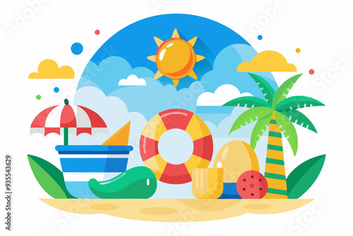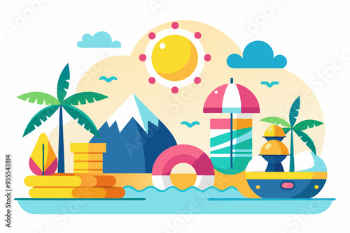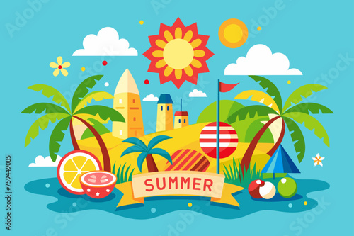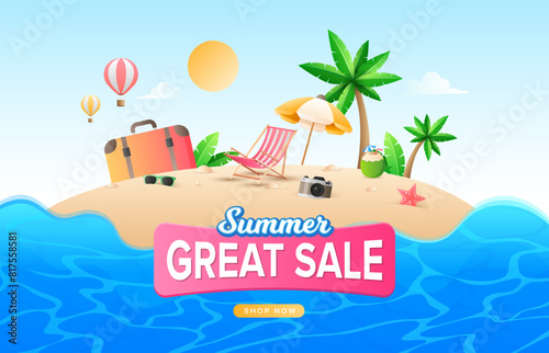 Fruit juice paper cut advertising vector. Promotion poster with healthy drink package over ocean or sea beachside origami style illustration