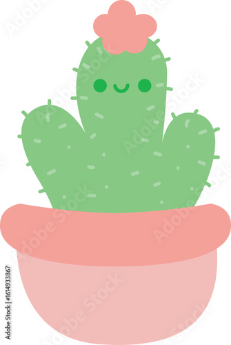 Cactus vector. Funny succulent plant mascot with pink blossom flower cartoon illustration. Cute cacti face with positive smile in flowerpot isolated on white background
