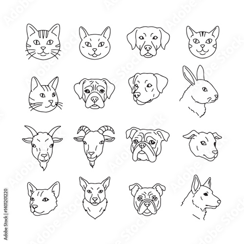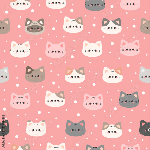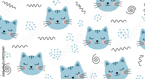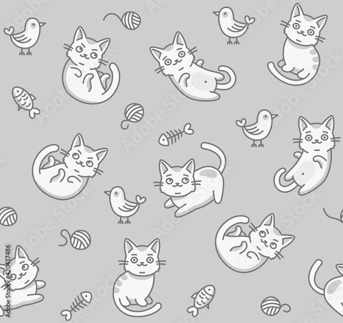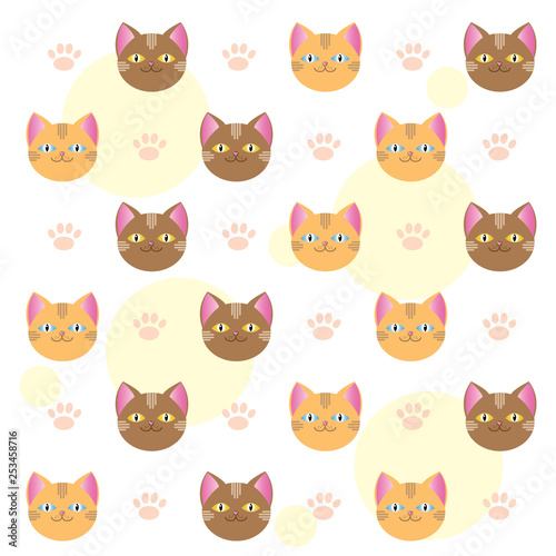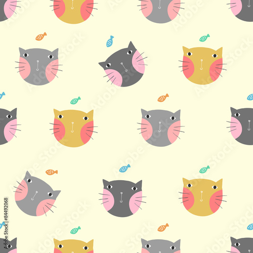 Funny cats vector seamless pattern. Creative design for fabric, textile, wallpaper, wrapping paper with cat heads, pet food, fish.