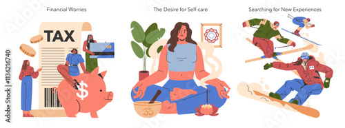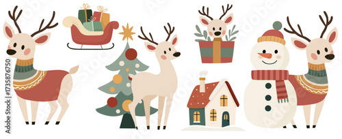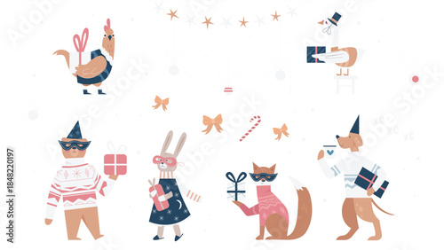 Funny doodle lamas alpacas flat vector set. Cute wild animal riding bicycle, sitting on gift boa and floating like angle illustration isolated on white background