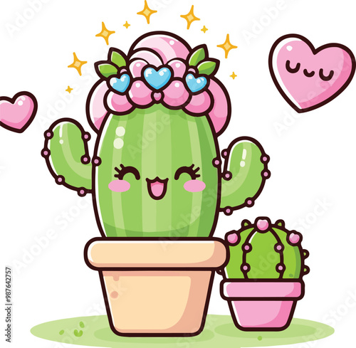 Cactus vector. Funny succulent girl plant mascot with pink blossom flower cartoon illustration. Cute cacti flirty smiling in flowerpot isolated on white background