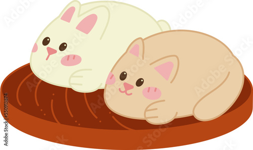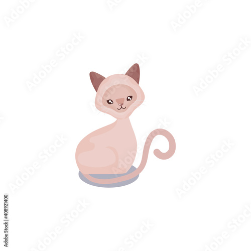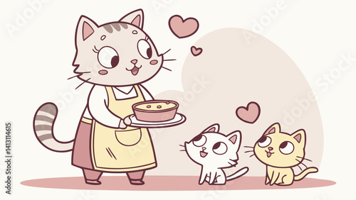 Well-fed cat vector. Cartoon chubby kitten eating dry food from bowl icon. Funny domestic animal illustration on white background