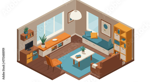 Furniture installation service concept. Vector isometric cutaway living room interior with worker carpenter installing wooden two-drawer cabinet.
