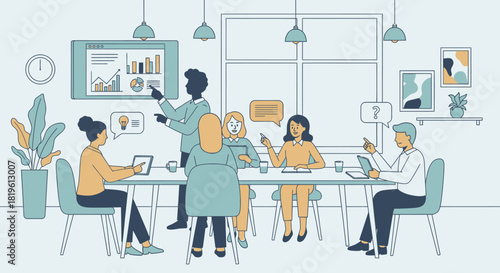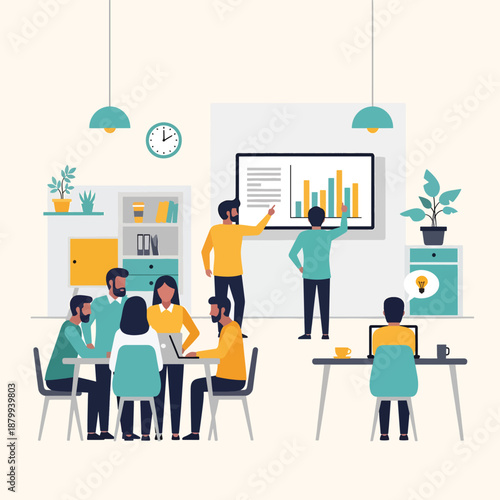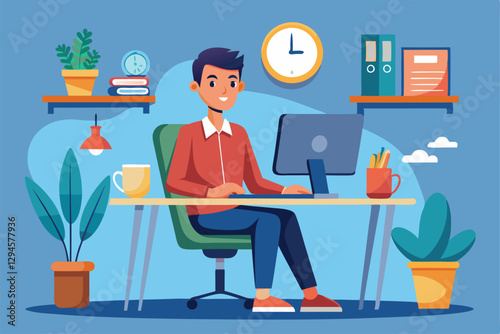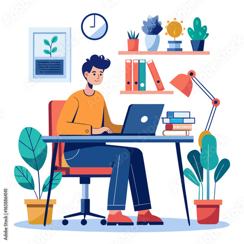 Game designer at work flat vector illustration. Freelancer animator programming gaming character on computer sitting at desk table in home office