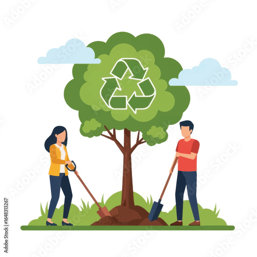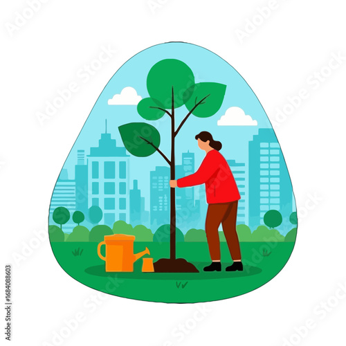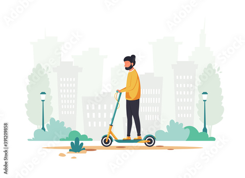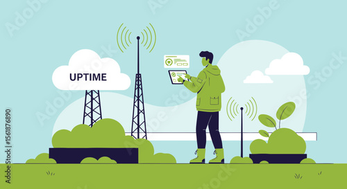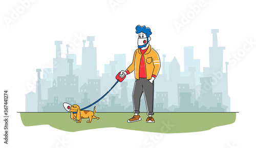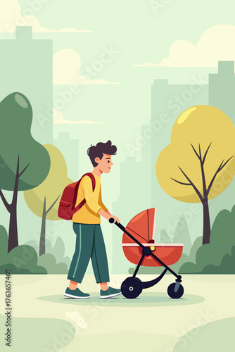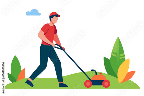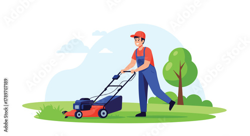 Gardener, male cartoon character mowing the lawn, cutting the grass with lawn mower, flat vector illustration. Gardening, home improvement services.