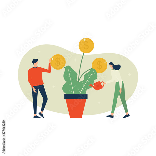 Gardeners man and woman picking apples from apple tree. Vector flat style design illustration isolated on white background. Gardening and harvesting concept for web banner, website page etc.