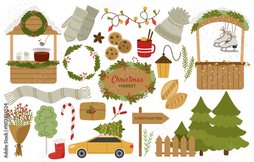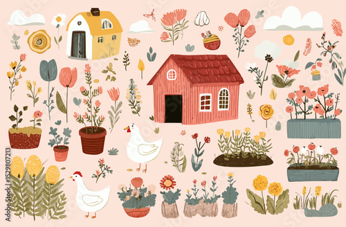 Gardening work scene set with happy gardener enjoying seasonal agricultural occupation at greenhouse and orchard. Planting tools and pruning accessories vector illustration