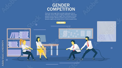 Gender competition web banner design template. Business people pulling rope. Vector flat style design illustration. Men vs women corporate war, contest concept.