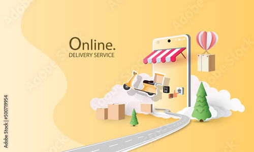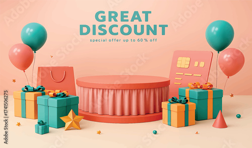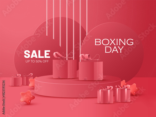 Gift box with ribbon and bow on display podium, paper cut plane, hot air balloons flying over world famous landmark silhouettes, vector illustration. Travel bonus loyalty program.