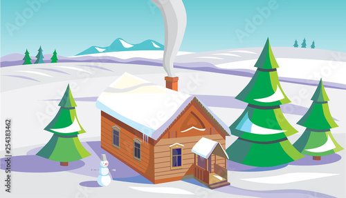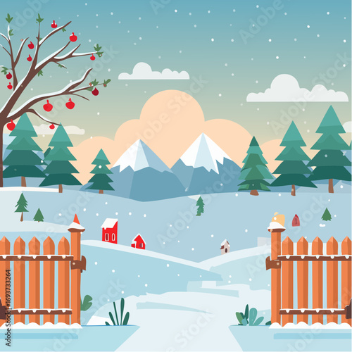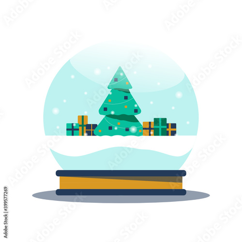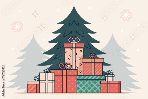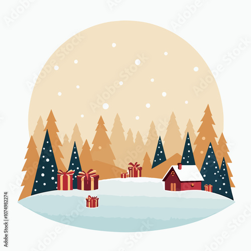 Gift box with golden ribbon and bow mockup set on display podium, paper cut winter background, vector illustration. Happy New Year, Merry Christmas seasonal sale, product pack ads template.