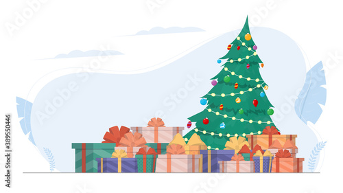 Gift box with golden ribbon and bow mockup set on display podium, paper cut winter background, vector illustration. Happy New Year, Merry Christmas seasonal sale, product pack ads template.