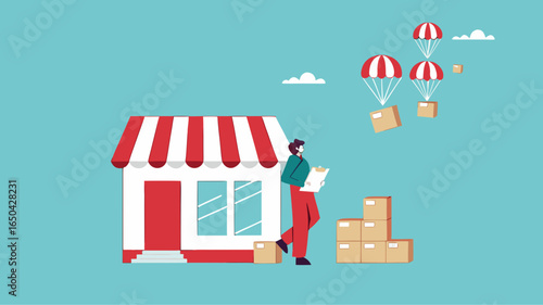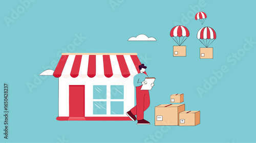 Micro characters holding huge gift card with pink ribbon and bow, vector flat style design illustration. Discount gift card, voucher, certificate marketing strategy tool.