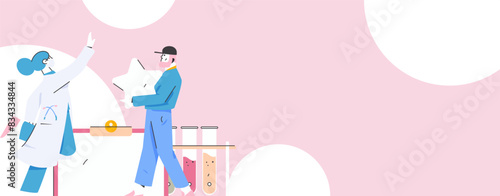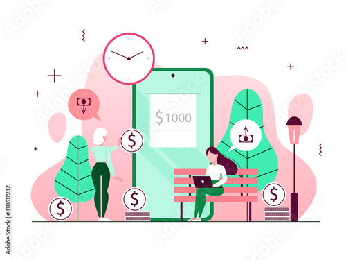 Gift in capital letters, happy people male and female characters with gift boxes, balloons, party popper, vector flat style design illustration. Party celebration.