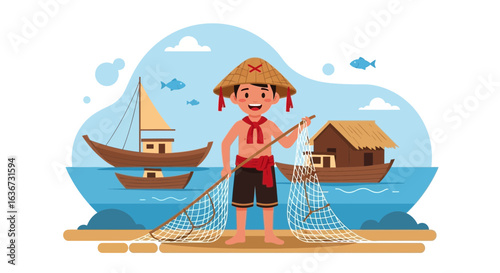 Girl brings sleeping dog to her bed. Home pet concept vector illustration. Woman travels by boat with her puppy dog.