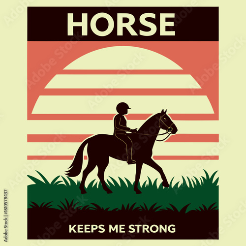 Young girl jockey riding horse in the saddle with helmet and hold bridle. Horse dressage, doing exercise and showing skills. Side view, vector illustration in flat design style