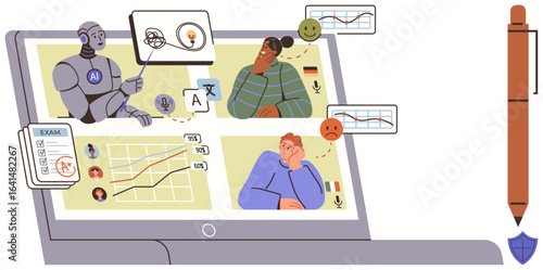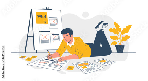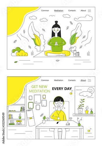 Girl is doing yoga and meditate in a park. Woman listen music at home. Work life balance. Meditation concept. Vector web site design template. Landing page website illustration.