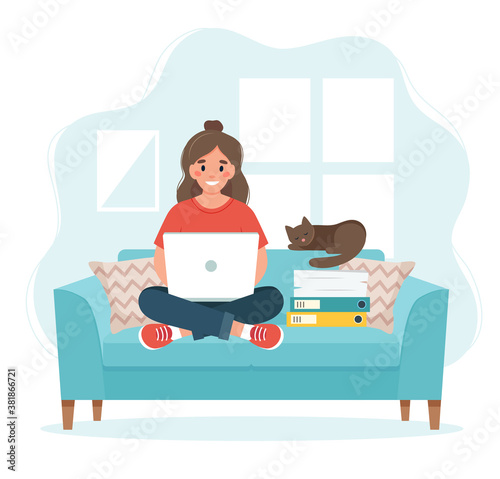 Girl reading book sitting in armchair in cozy living room, flat vector illustration. Young woman studying, taking rest at home, enjoying reading in free time. Hobby and leisure activity, education.