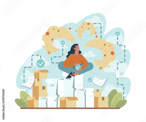 Girl reading book sitting on bench in city park, flat vector illustration. Happy woman enjoying free time walking with dog, taking rest and reading favorite magazine. Hobby and leisure, education.