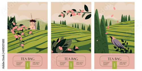 Girl riding bicycle on rural road. Outdoor nature landscape and countryside farm. Girl with fresh flowers. Vector web site design template poster.