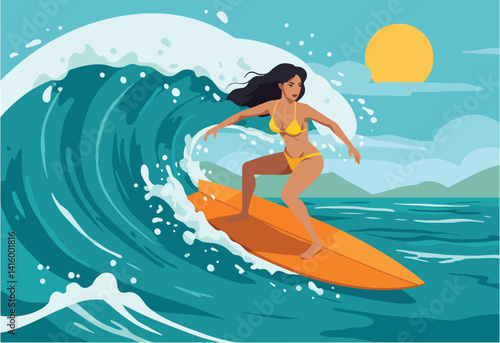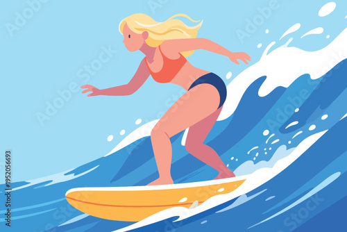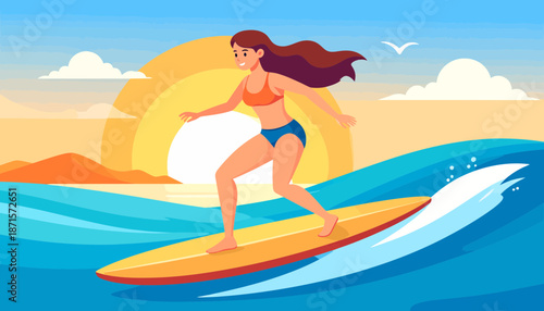 Vector illustration of young girl standing on surfboard and riding on ocean wave. Water sports concept design element in flat style.