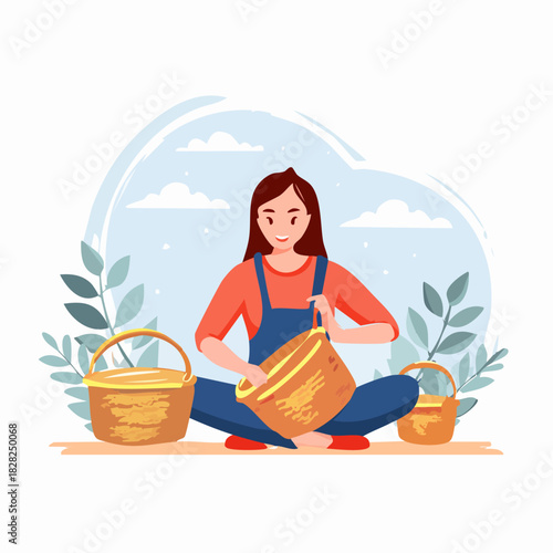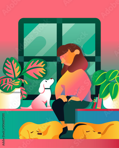 Girl taking care of house plants growing in pots. Houseplants and home garden concept illustration. Vector web site design template. Interior with cactus and green plants.