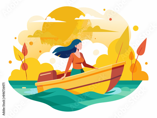 Sunrise landing page design, website banner template set, flat vector illustration. Girl watching sunrise sitting on river bank. Woman dreaming, drinking coffee, taking nature photo. Summer vacation.